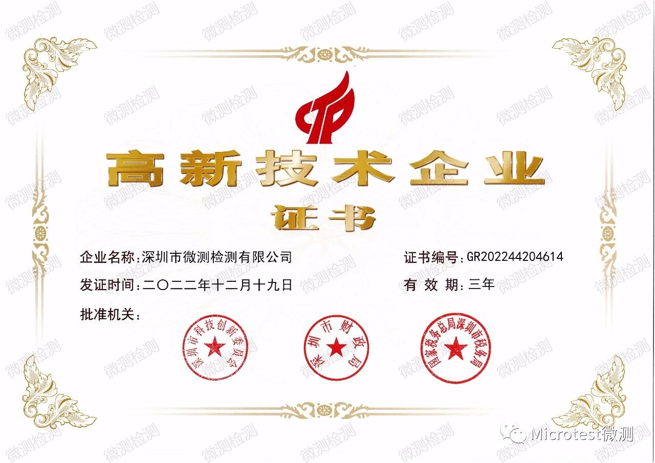 近日,深圳市微測檢測有限公司再次獲得由國家稅務總局深圳市稅務局、深圳市科技創新委員會、深圳市財政局三部門聯合頒發的國家級《高新技術企業》證書,連續榮獲國家“高新技術企業”稱號,充分體現了微測檢測領先的技術創新能力、技術研發能力和經營管理水平。