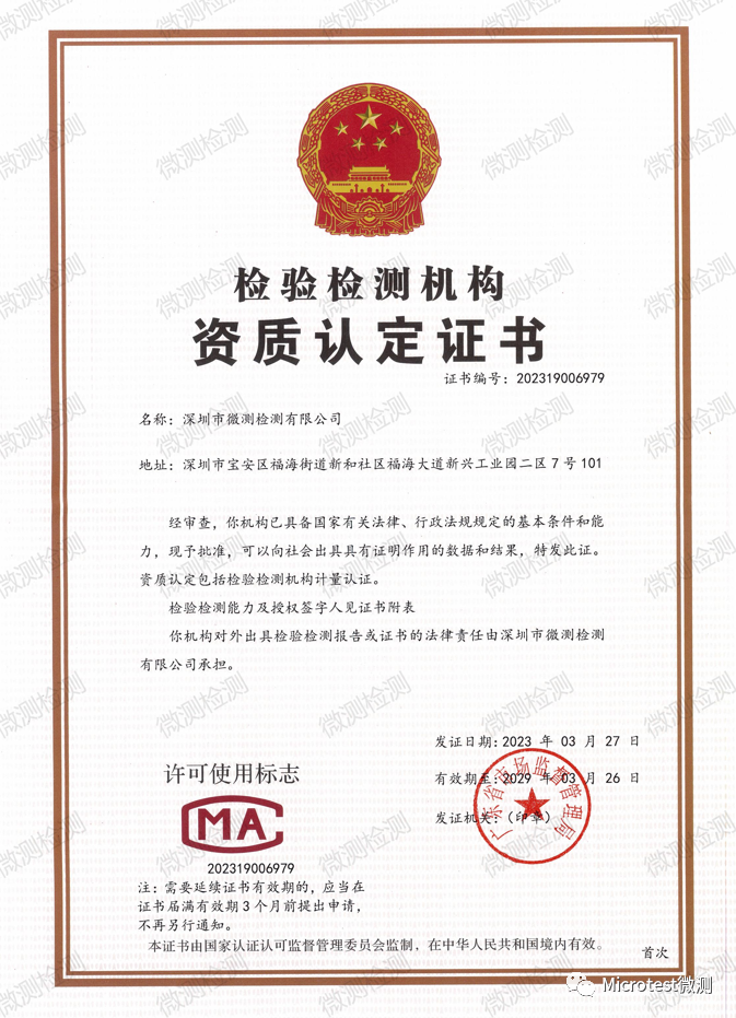 微測檢測一直致力于保持質(zhì)量合規(guī)、遵守相關(guān)法律法規(guī)和標準化經(jīng)營,其中包括證書更新以確保業(yè)務(wù)的順利運營。因此,微測檢測嚴格按照檢驗檢測資質(zhì)認定證書的更新要求,于2023年1月進行了證書的有效期延續(xù)更新,以確保資質(zhì)證書的有效性和合法性。新證書的頒發(fā)是基于對我們的檢測業(yè)務(wù)和運營操作的全面評估,并經(jīng)過相關(guān)監(jiān)管機構(gòu)的審核及批準。