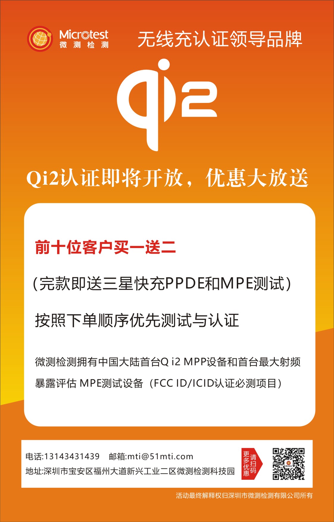 微測檢測擁有中國大陸首(多)套Qi2 MPP設備和首臺最大射頻暴露評估MPE測試設備(FCC ID/ICID認證必測項目。微測檢測自2018年成為無線充電聯盟WPC-ATL授權實驗室以來,得到了廣大產業界的信任和支持,是無線充認證的領導品牌。在Qi2認證即將開放之際,特舉行優惠大放送,詳見活動海報,內容如下: