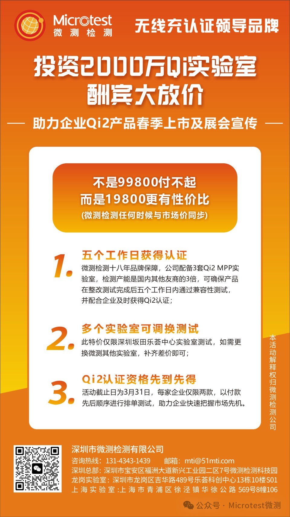 微測檢測在展會期間推出了Qi2認證優惠,首單價格19800元,性價比極高,助力企業Qi2產品春季上市及展會宣傳。不是99800付不起,而是19800更有性價比,擊穿底價的同時承諾任何時候與市場價同步。微測Qi2實驗室支持五個工作日獲得認證,還可多個實驗室可調換測試,Qi2認證資格先到先得,活動截止日為3月31日。詳情咨詢公司各客戶代表,或微測在線客服。電話:13143431439(微信同號)。