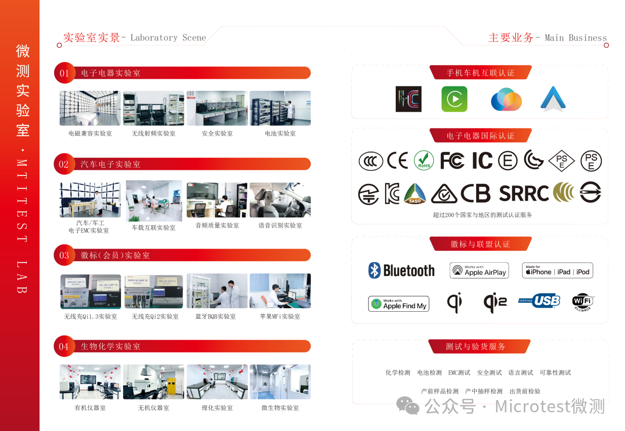 公司擁有20余個專業實驗室,128人的工程師團隊,10000㎡檢測科技園,獲得了CNAS、CMA、A2LA、CBTL、WPC、Bluetooth SIG等授權和認可。公司可為企業提供全球上百個國家的測試與認證、驗廠與驗貨服務,包括華為HiCar、無線充Qi、藍牙BQB、蘋果MFi等眾多授權認證服務。無論企業身處何地,無論產品類型如何,微測檢測都能提供一站式解決方案,幫助企業順利進入全球市場。