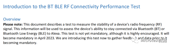 根據(jù)Amazon關(guān)于藍(lán)牙性能的文檔要求顯示,自2023年4月起,BLE-RF將成為部分類(lèi)型產(chǎn)品的Amazon Alexa認(rèn)證的強(qiáng)制測(cè)試項(xiàng)目。