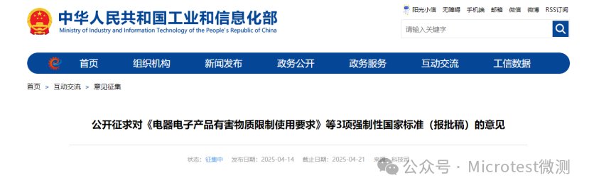 2025年4月14日,中華人民共和國工業(yè)和信息化部網(wǎng)站發(fā)布公告:根據(jù)國家標(biāo)準(zhǔn)委下達的強制性國家標(biāo)準(zhǔn)制修訂計劃,工業(yè)和信息化部組織完成了《電器電子產(chǎn)品有害物質(zhì)限制使用要求》等3項強制性國家標(biāo)準(zhǔn)(報批稿)的編制工作。為進一步聽取社會各界意見,現(xiàn)對標(biāo)準(zhǔn)報批稿及編制說明(見附件1、2)予以公示,截止日期2025年4月21日。
